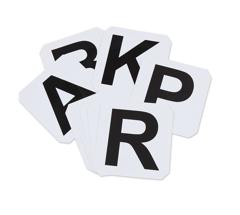 Self-adhesive letters for marking out a dressage arena. Set of 12: A B C E F H K M R S V P. Dimensions: 20cm (8) x 19cm (7.5).