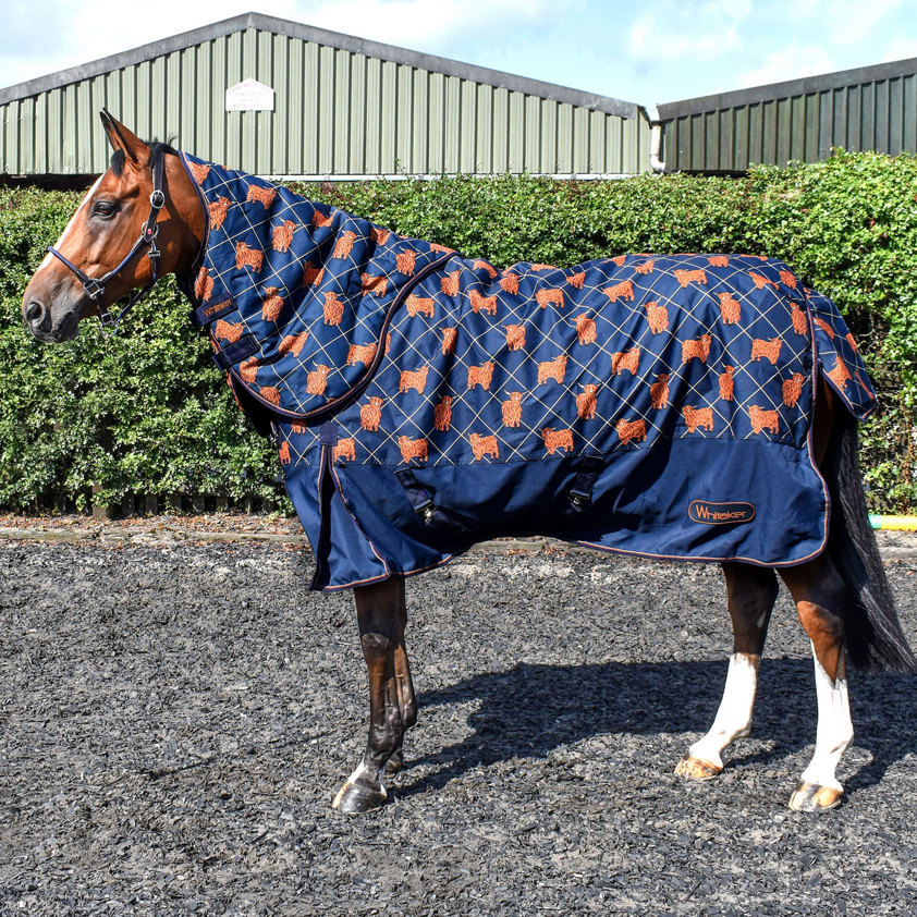 This adorable printed turnout rug features a curious Angus with his shaggy coat and full fringe nested in a classic check print. Perfect for warmer wet weather or for layering during colder days this medium weight turnout rug and neck set features a durable 600D outer to withstand day to day in the field. The neck cover attaches using velcro straps keeping it in place. Features a 600D ripstop outer, buckle adjustable chest fasteing with three D-rings, crossed belly surcingles. Waterproof and breathable, it also features 170gm fibre fill, shoulder gusset and a large tail guard.